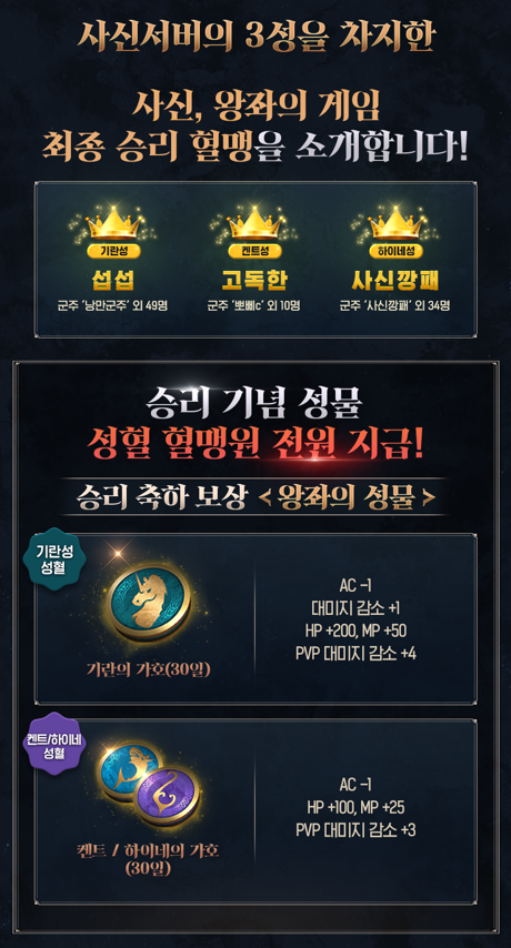 다음으로 사신 서버 왕좌의 게임 보상 지급 안내입니다. 사신서버 3성을 차지한 혈맹이 발표되었는데요.