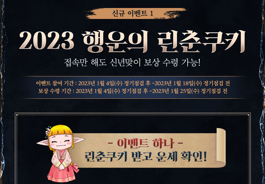 1월 1주차 업데이트의 메인은 2023년 행운의 린춘(리니지 포춘)쿠키 이벤트입니다. 적용 서버는 전 서버를 대상으로 진행됩니다.