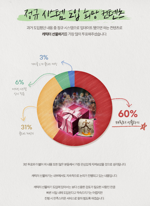 지난 설문에 핫이슈였던 것, 제일 관심이 많았던 캐릭터 선물하기 입니다.
