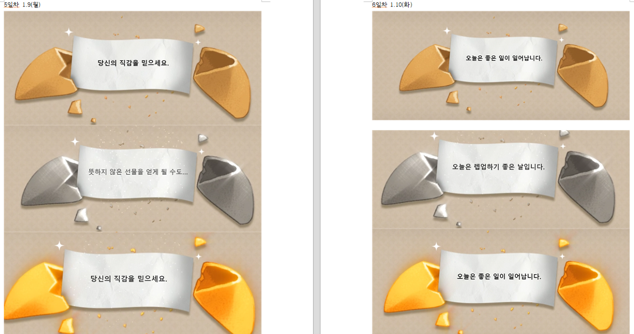 10일 정도 린춘 쿠키를 했는데요. 어떤 내용의 운새 / 점괘가 나왔는지, 혹시 제가 나오지 않은 운새 / 점괘가 있으시면 공유해주시면 좋겠습니다.