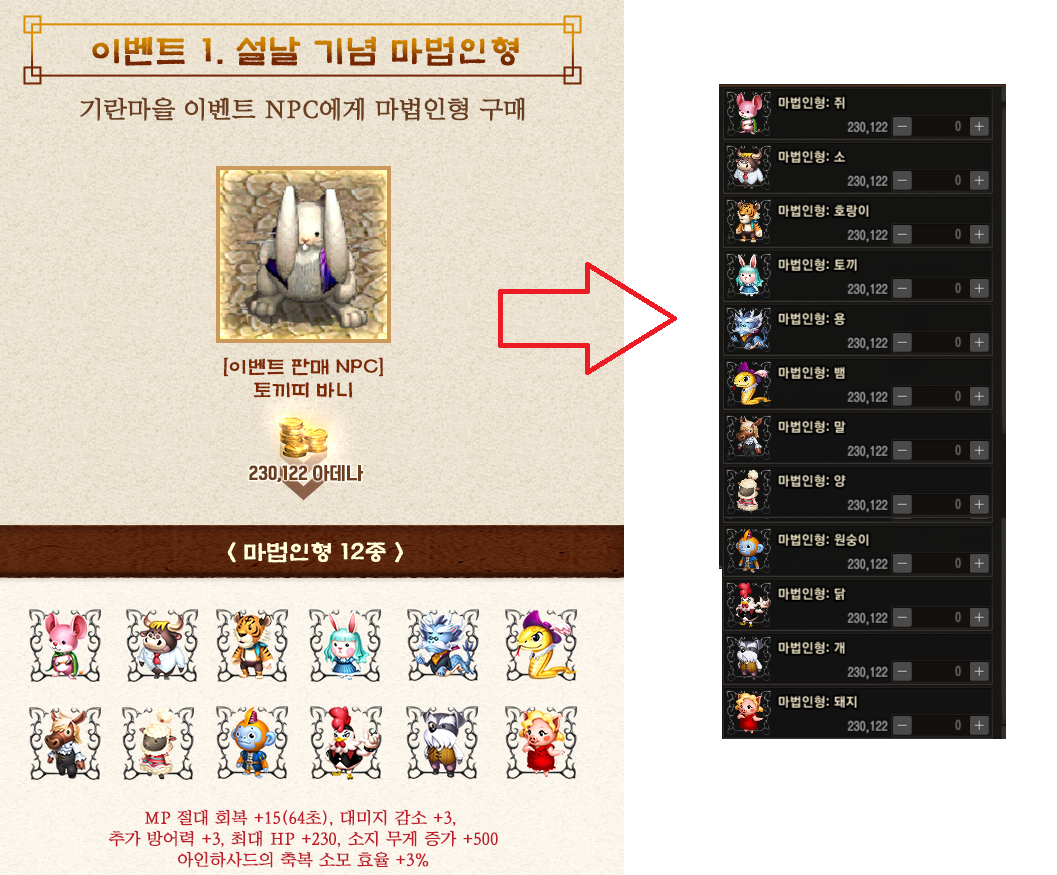 우선 바니는 인형을 판매합니다. 비용은 230,122원 입니다. 총 12가지 인형(12지신)을 판매합니다. 각 인형별로 효과가 다른 것은 아니니 그냥 아무것나 구매하시면 됩니다.