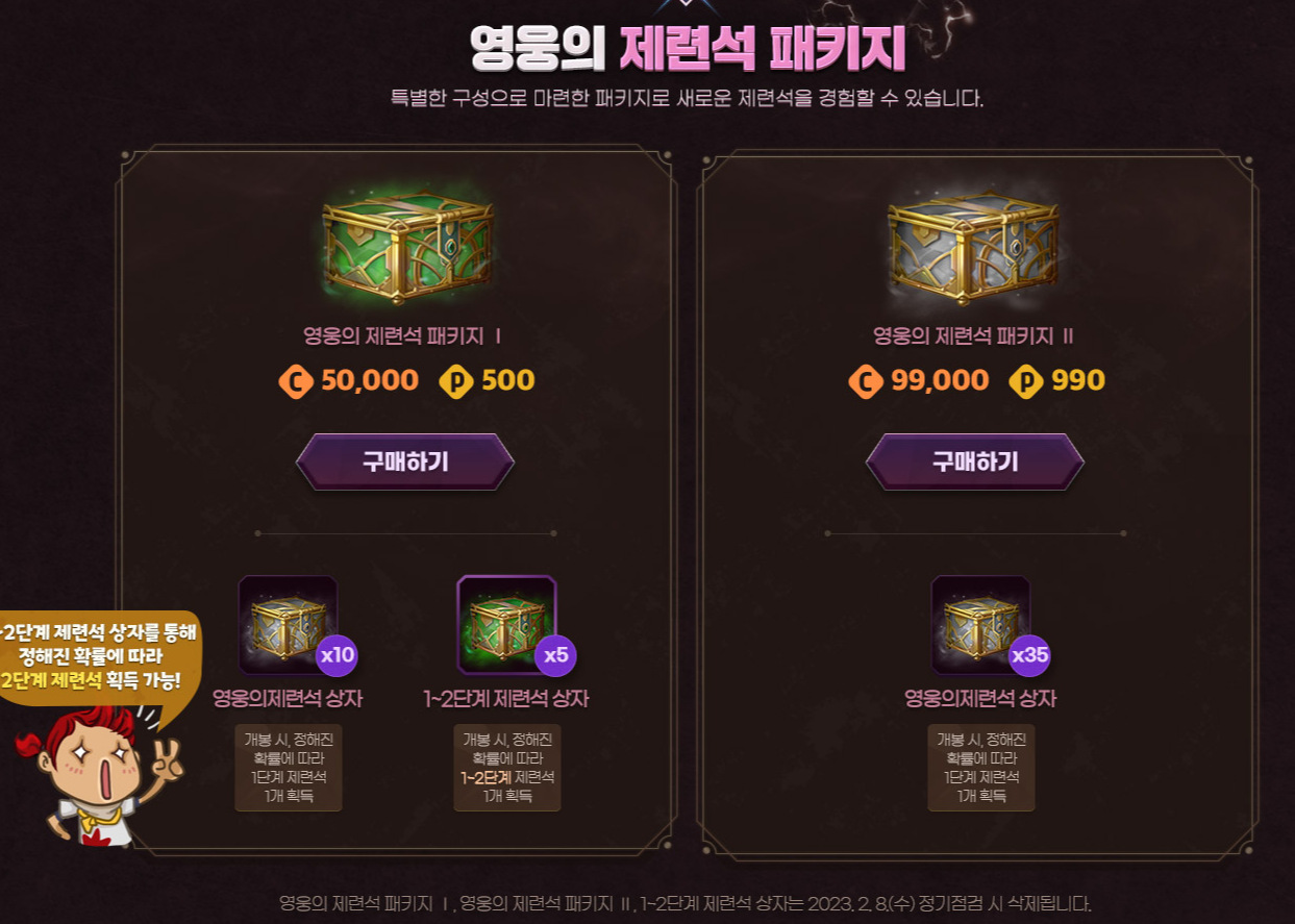 상자 I은 1~2단계 제련석 상자 5개와 영웅의 제련석 상자 10개, 상자 II는 영웅의 제련석 상자 35개를 구매할 수 있습니다.