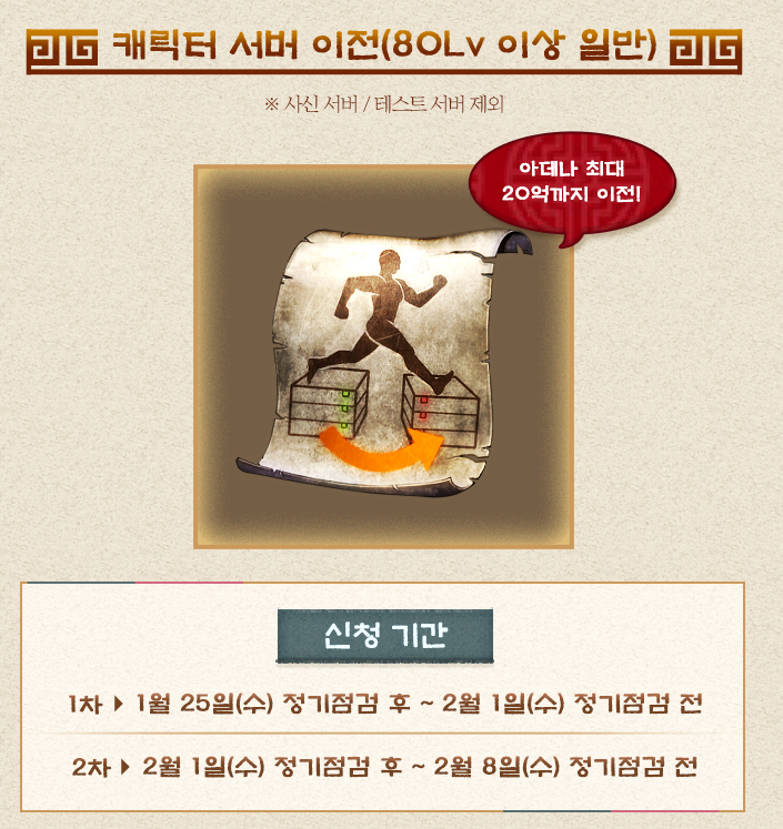 그리고 기다리고 기다리던 서버이전과 캐릭터 이름 변경 이벤트가 진행됩니다. 지난 설문조사 때 서버이전 불편사항에 아데나 제한이 있었는데요. 이번 차수에는 20억까지 이전이 가능합니다.