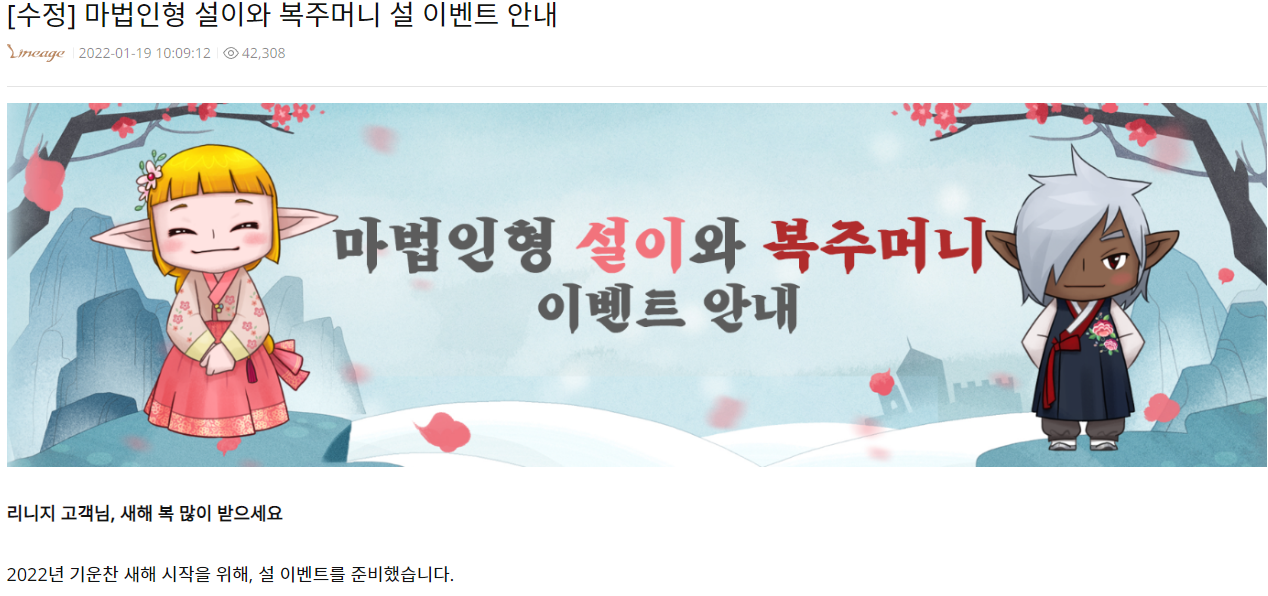 2022년의 경우 아래와 같이 마법인형 설이와 복주머니 이벤트라는 배너가 생성이 되고 이벤트 페이지에 올라왔는데요.