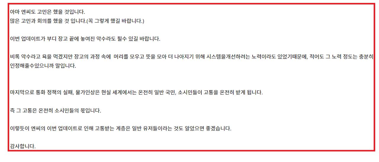 이런 사소한 것으로 분노하는게 웃기기도 하지만 게임을 하는 유저 입장에서는 화가 날 업데이트였습니다.