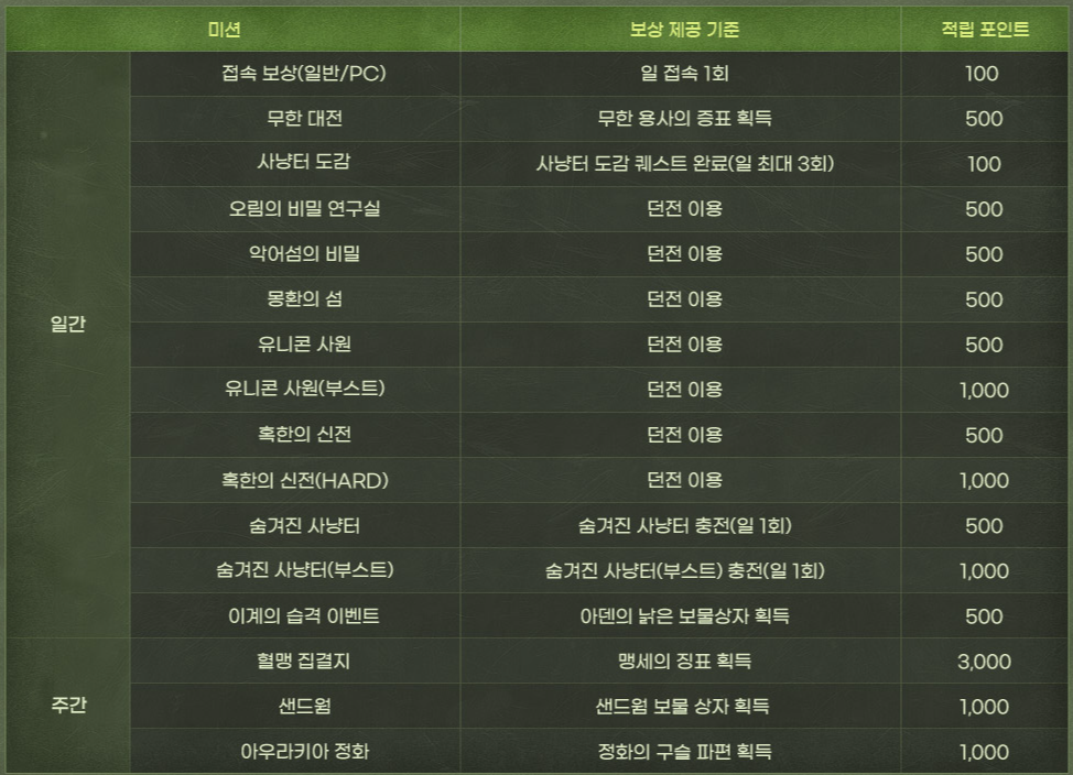위에는 게임 접속이나 인던 등 플레이를 통해 쌓이는 포인트이며, 마일리지로 받을수 있는 것은 아래와 같습니다.
