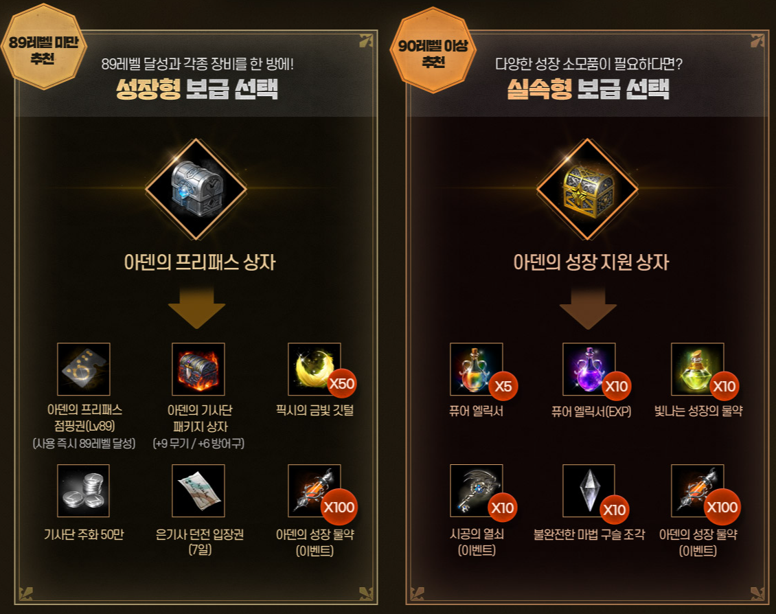 보급 선택상자는 성장형과 실속형이 있는데요.