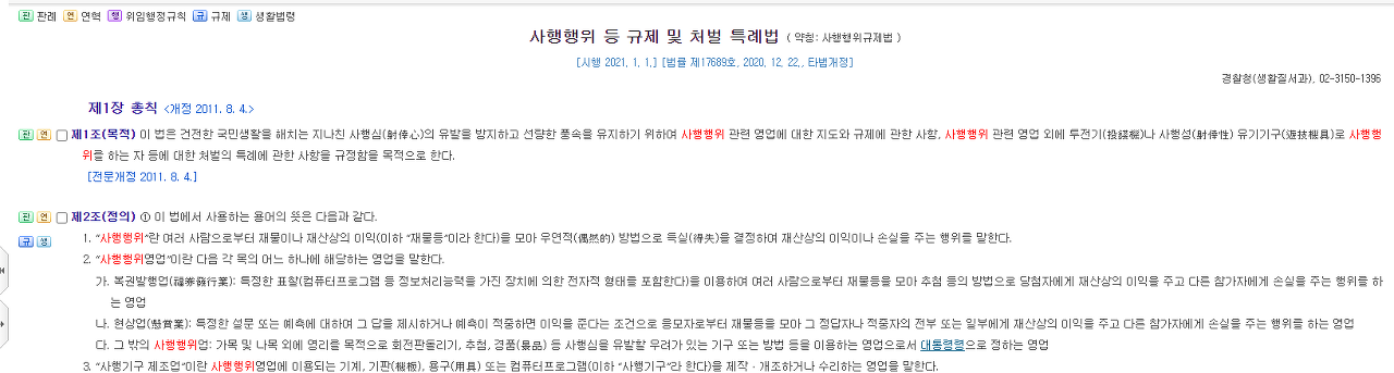 사행성 게임물을 판단 / 적용하는 근거는 사행행위 등 규제 및 처벌 특례법 ( 약칭: 사행행위규제법 )입니다. 이 법 제 2조에서는 사행행위에 대해 아래와 같이 정의하고 있습니다.