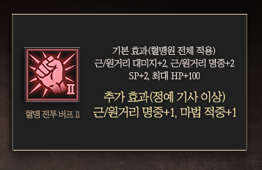 기본적으로 적용되는 것 외에도 혈맹버프 2단계의 경우 정예기사 이상이 되면 명중 +1이 적용됩니다.