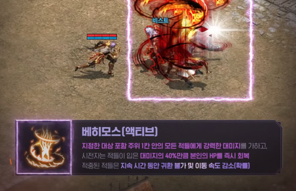 습득레벨은 90레벨로 4칸 안의 플레이어와 그 주변 1칸 안의 모든 플레이어를 대상으로 강력한 대미지를 가하고 스킬을 시전한 용기사는 대미지의 40%만큼 체력을 회복하게 됩니다. 또한 스킬을 시전당한 플레이어 캐릭은 일정 확률로 귀환 불가와 이동 속도 감소되는 효과를 받게 됩니다.