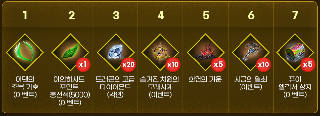 아덴의 축복배지는 아인 축복을 일일 5천이 충전가능하고 총 7회 사용이 가능합니다.