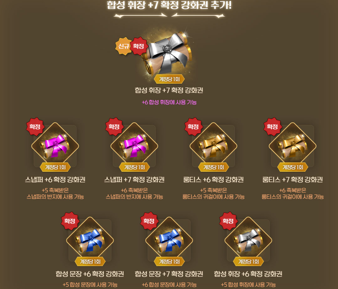 더불어확정강화권 이벤트도 하는데요. +6확장 강화권 중 반지와 귀걸이는 +3 얻**하는 해당 상자 10개로 교환이 가능합니다.