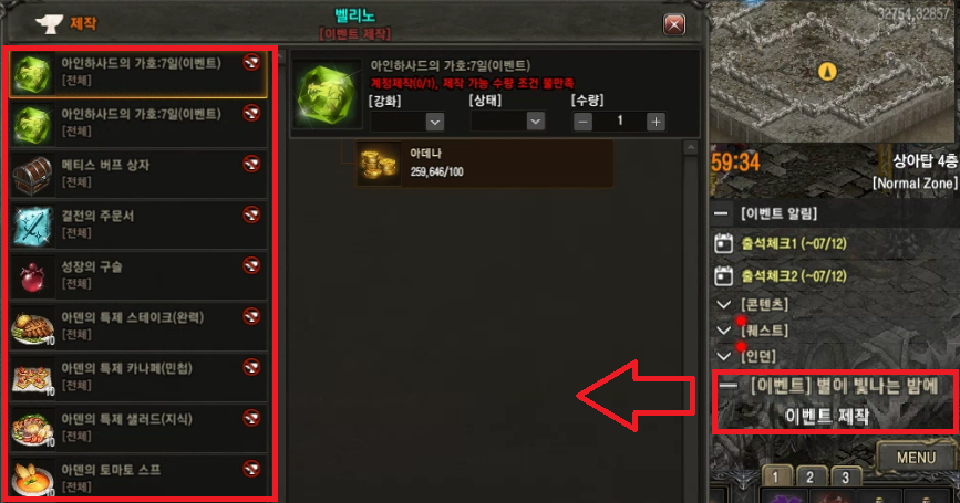 아인 가호가 필요 없으신 분들의 경우 버프상자, 결전의 주문서, 성장구슬(1) 등을 제작할수 있습니다.