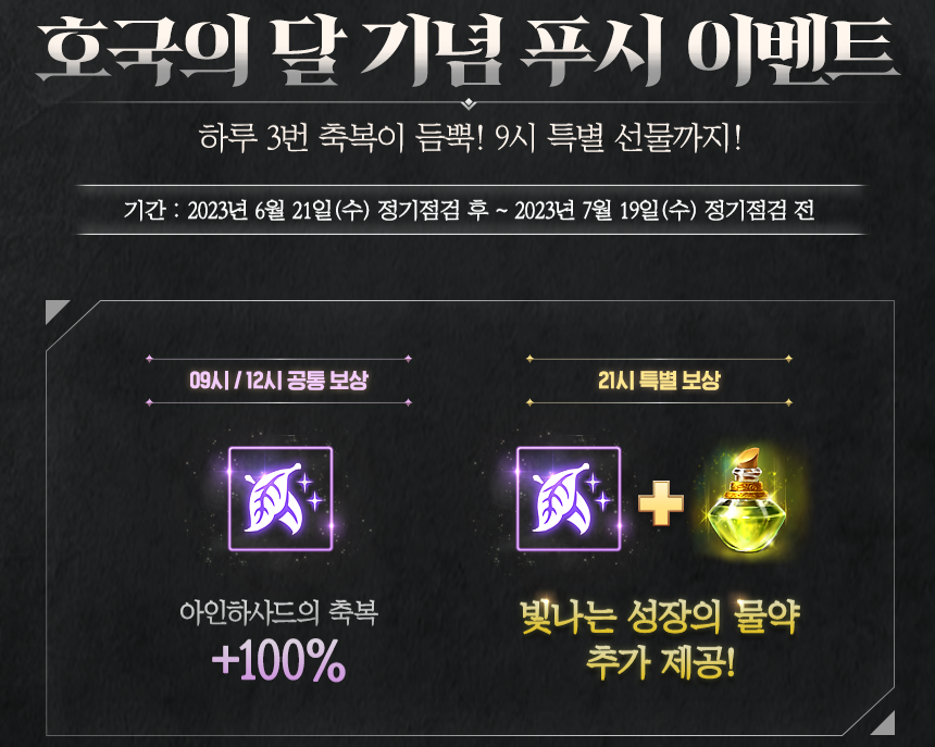 개인적으로 약간 아쉬운 점이 있다면 6월 호국의 달을 맞이하여 지난 5월 31일 정기점검 때 현충일 버프 부터 간단 없이 진행되었다면 더 뜻깊은 이벤트가 되지 않았을까? 라는 생각이 드네요. 꼭 아인 축복 푸시가 아니더라도 말이죠.
