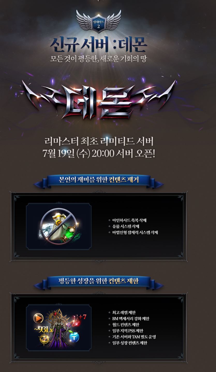 반면, 아인 축복이나 유물, 잠재력 시스템은 적용되지 않으며, 다른 서버와 달리 월드 컨텐츠도 적용되지 않습니다.