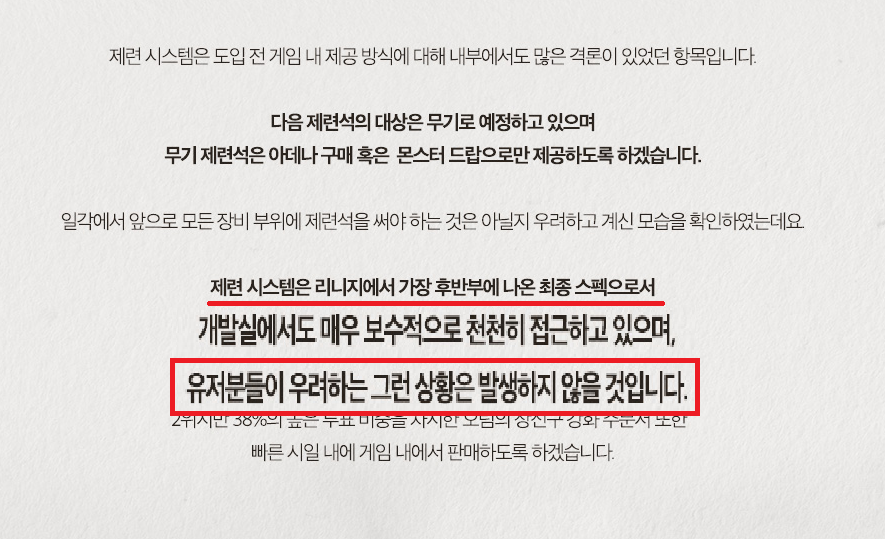 심지어 다음 제련석은 무기로 예정하고 있다는 말도 어긋났고, 아데나 혹은 몬스터 드랍으로만 제공하겠다는 약속도 공허해 보입니다.