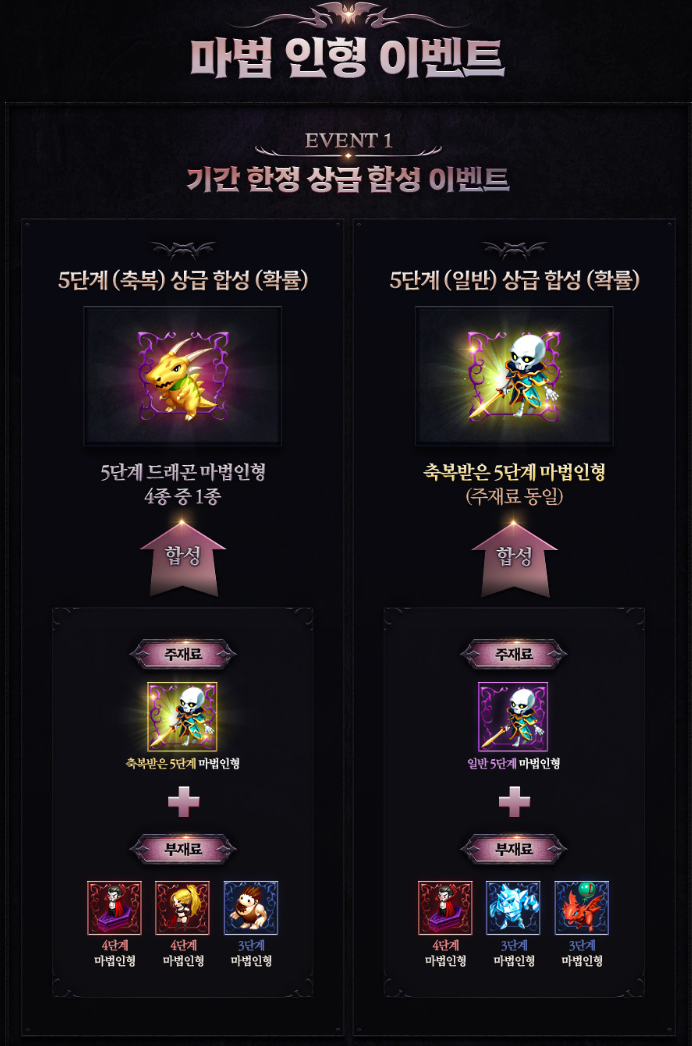 이벤트 기간 동안은 일단 5단계 마법인형과 축복받은 드래곤 마법인형 성공확률이 일시적으로 상향됩니다.