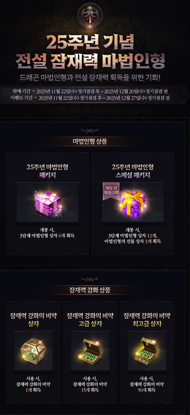 다음으로 살펴볼 이벤트는 25주년 기념 전설 잠재력 마법인형 이벤트 신규 상품입니다.