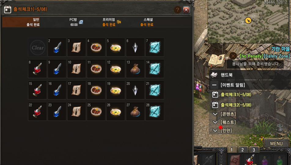 마지막으로 살펴볼 이벤트는 출석체크 입니다. 출석체크 1, 출석체크2로 구분이 됩니다.