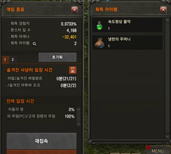 결과는 바로바로 ‘속도향상 물약’ 즉 촐기 1개를 득하였고 경험치는 0.0733%를 먹었습니다.