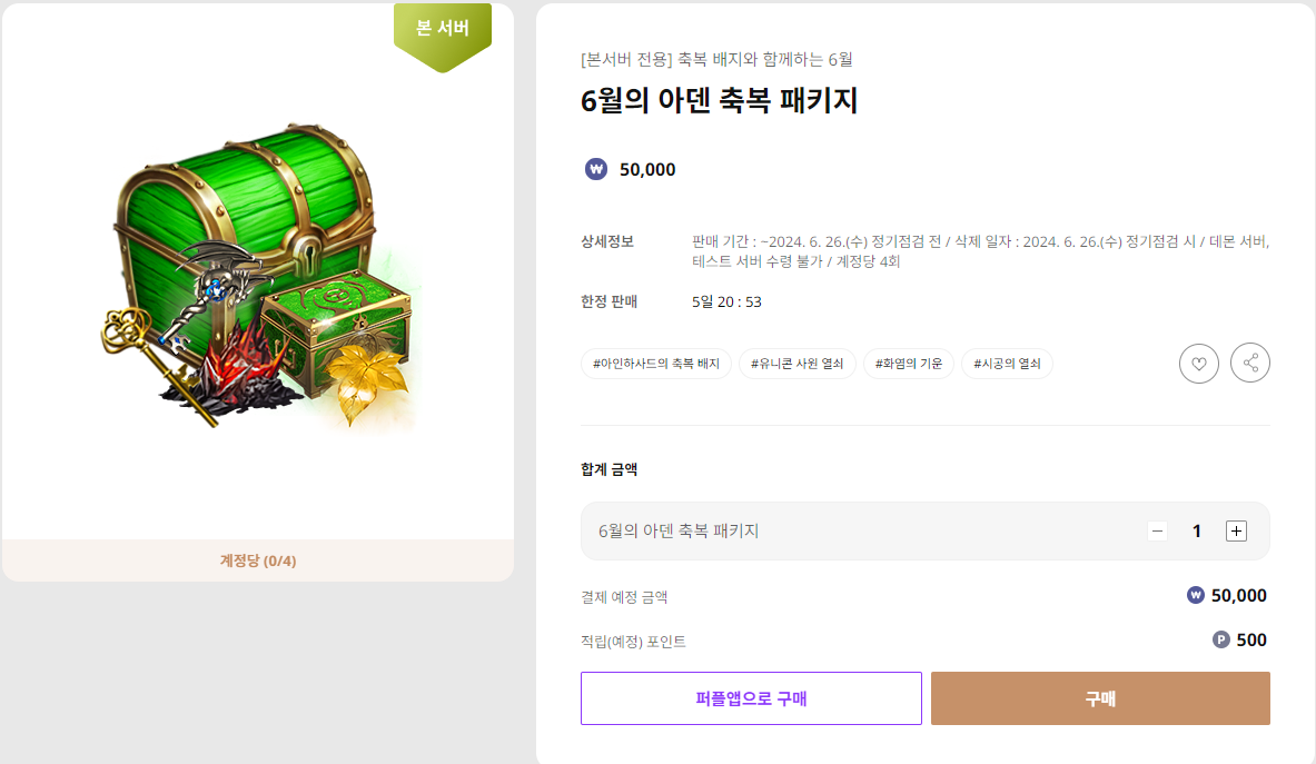 구매를 하게 되면 축복배지 상자 1개와 유니콘 열쇠 5개, 화염의 기운 5개, 시공의 열쇠 10개 획득이 가능합니다.