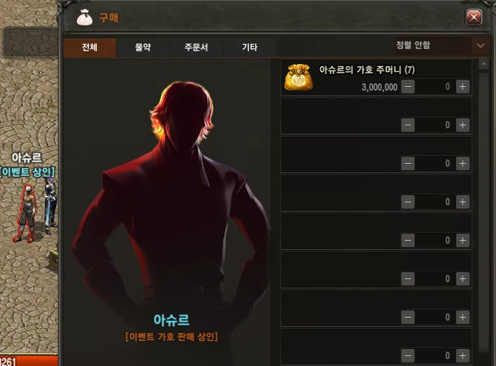이 아슈르를 통해 아슈르의 가호 주머니를 3백만 아데나에 구매가 가능합니다.