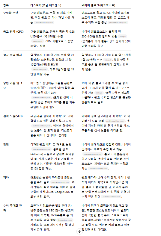 반면 애드센스 승인 문턱이 높고(콘텐츠 품질 요구) 초기 방문자 확보가 어려우며, 네이버 플랫폼 내부 유입이 부족하다는 제약이 있습니다.