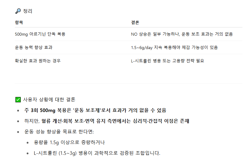 현재 복용 중인 루틴인 "주 3회 500mg 아르기닌"은 안전하며, 면역계에 부담을 주지 않으면서도 효과적인 보충 전략으로 적합합니다.