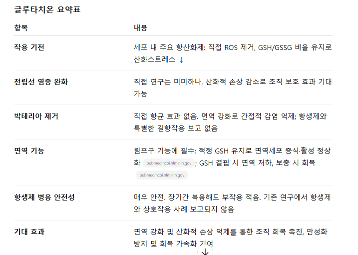 글루타치온: 매우 안전한 보충제로 알려져 있으며, 약물 상호작용 보고가 거의 없습니다. 오히려 항생제 치료로 인한 산화적 손상을 줄여 면역 환경을 개선하므로 병용 시 특별한 위험 요소는 없습니다.