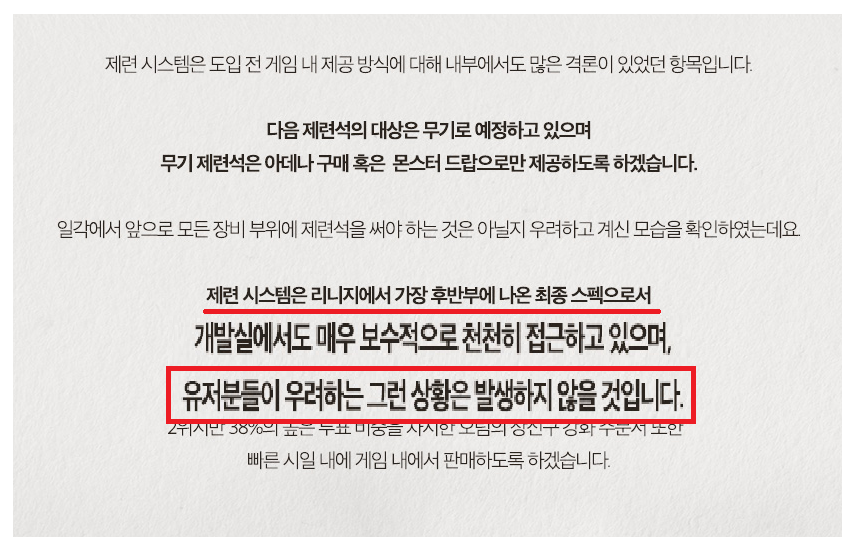 유저들은 단순히 “제련석 좀 안 넣어 달라”고 말하는 것이 아니다. “우리가 돈을 내는 만큼 투명하고 공정한 게임이어야 한다”고 요구하는 것이다.