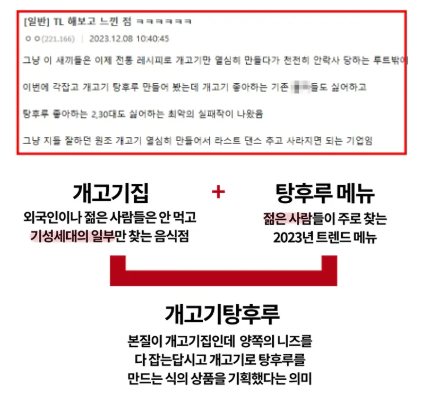 개고기집 비유가 통하는 이유는 여기에 있습니다. 이미 젊은 세대의 입맛은 떠났으나, 이러한 손님이 불만을 이야기해도, 결국 매출을 위해 다시 개고기를 권하거나 부위를 다양화해서 판매한다는 이미지가 강합니다.