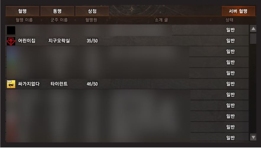 서버 혈맹 조회를 해보면 어린이집 혈맹의 인원 수는 35명입니다. 없다혈맹은 46명입니다.